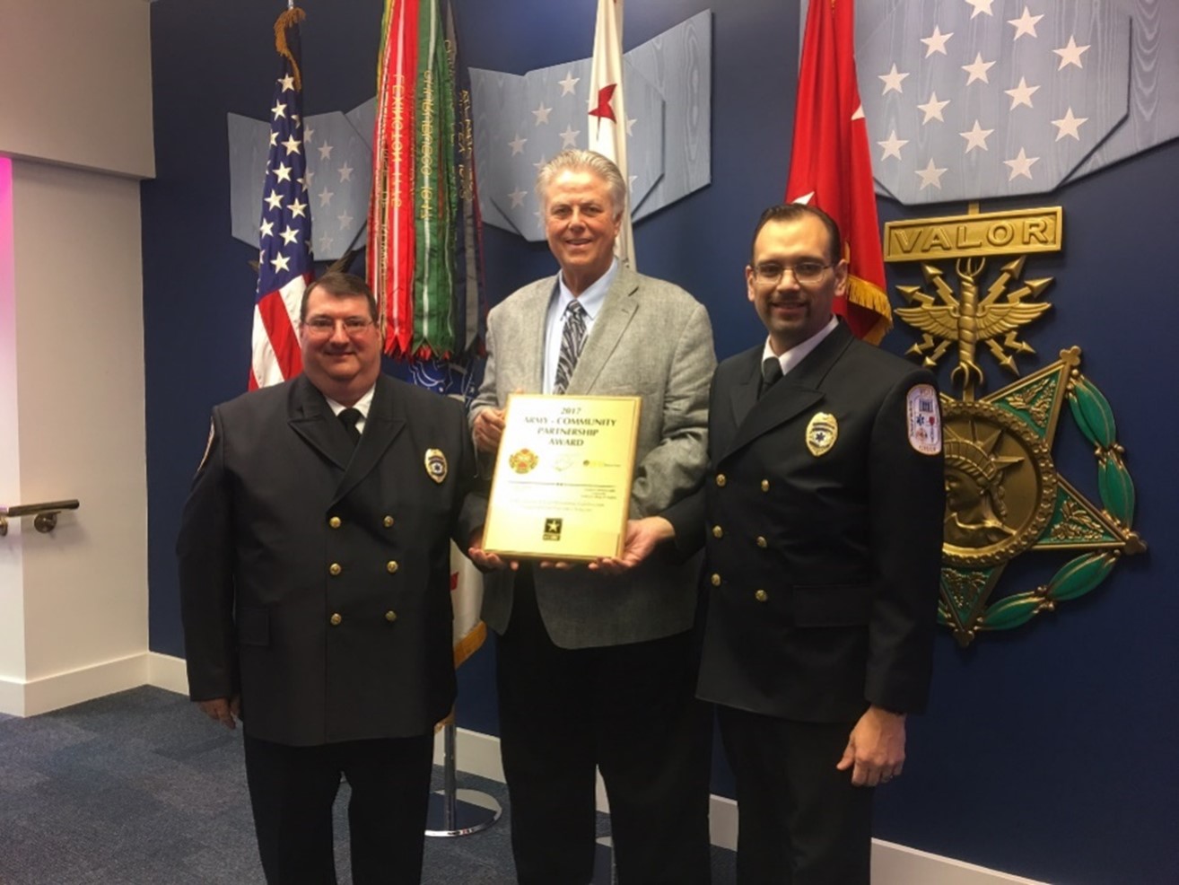 Ken Williams (left), Jay Gould (center), and Basil Asay (right) in the Pentagon display the DOD US Army Community Partnership Award in 2017.